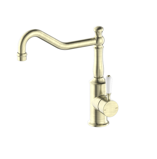 York | Aged Brass Kitchen Mixer Hook Spout With White Porcelain Lever