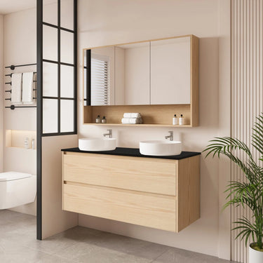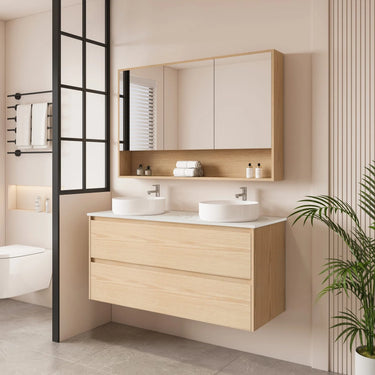 The HERA 1200mm Wall-Hung Vanity in Tas Oak combines natural charm and efficient storage with versatile basin and stone top options, ideal for compact spaces.