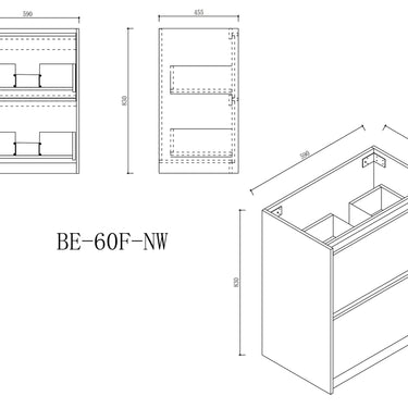 590 × 455 × 830 mm freestanding cabinet with two spacious DTC soft-close drawers, ideal for compact bathrooms or powder rooms.