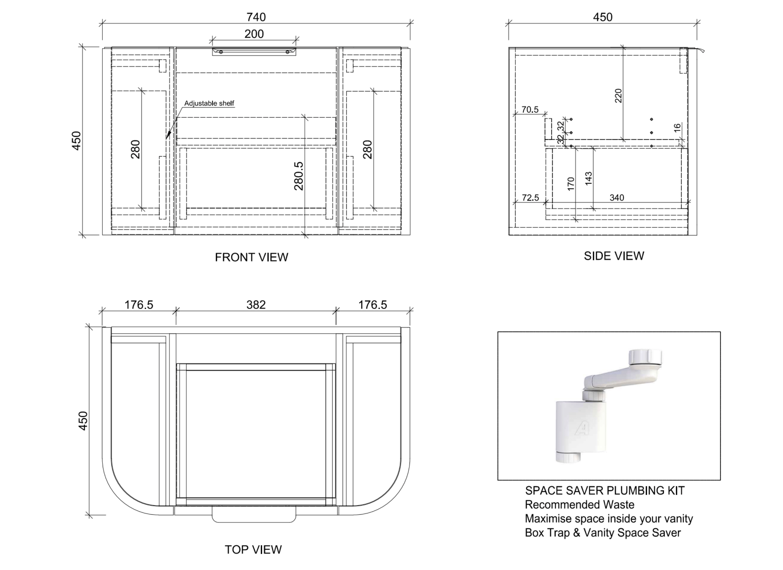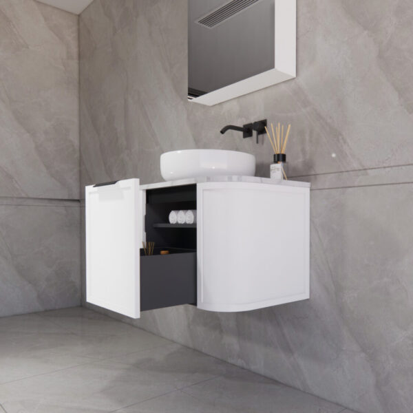 Houston matt white wall hung plywood vanity 740x450x450mm. The Houston vanity showcases a sophisticated curved silhouette that enhances its contemporary appeal. Equipped with two spacious side drawers, the cabinet ensures ample storage for all your bathroom essentials. The big curved corner goes with a matched White Carrara or Pure White Stone top. The Houston Series vanity combines style and practicality, making it the centerpiece of a luxurious bathroom.